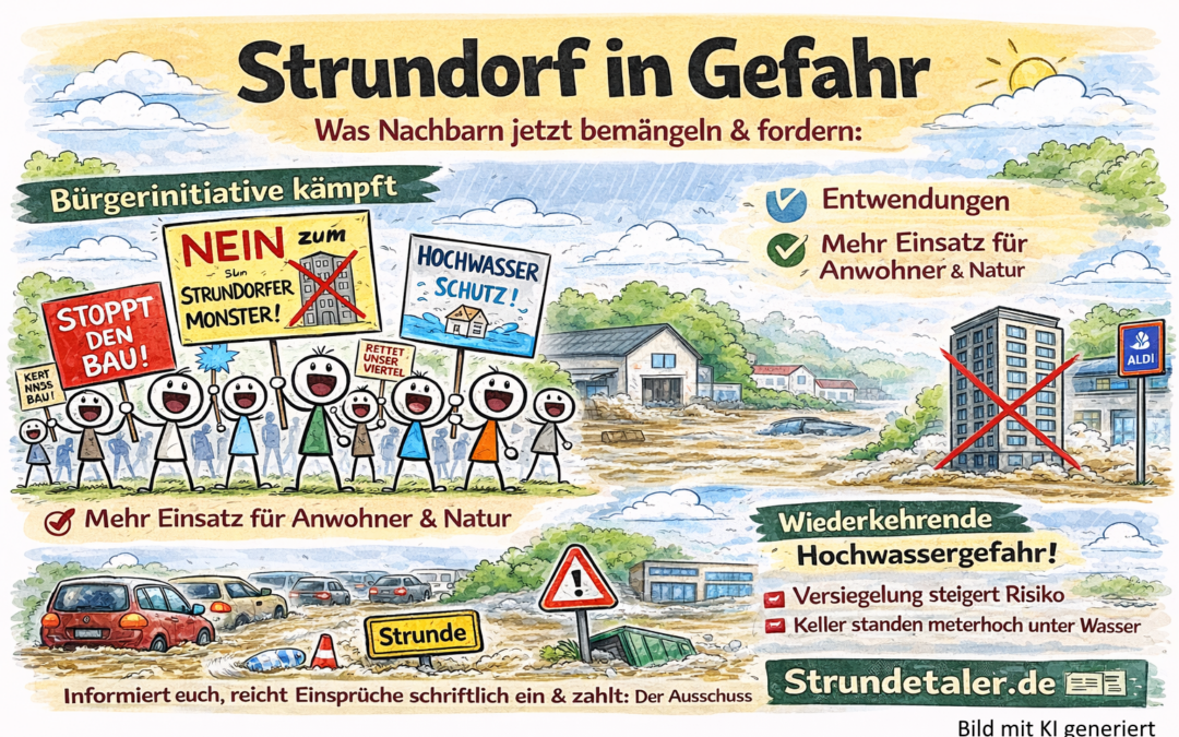 Gründung und Vernetzung: Die ersten Treffen der Initiative fanden bereits im August 2025 statt, Monate bevor das Projekt öffentlich diskutiert wurde. Ziel war es, Probleme wie Verkehrsbelastung, Hochwassergefahr und bauliche Verdichtung gemeinsam zu identifizieren und Strategien für das Vorgehen zu entwickeln. (strundetaler.de)