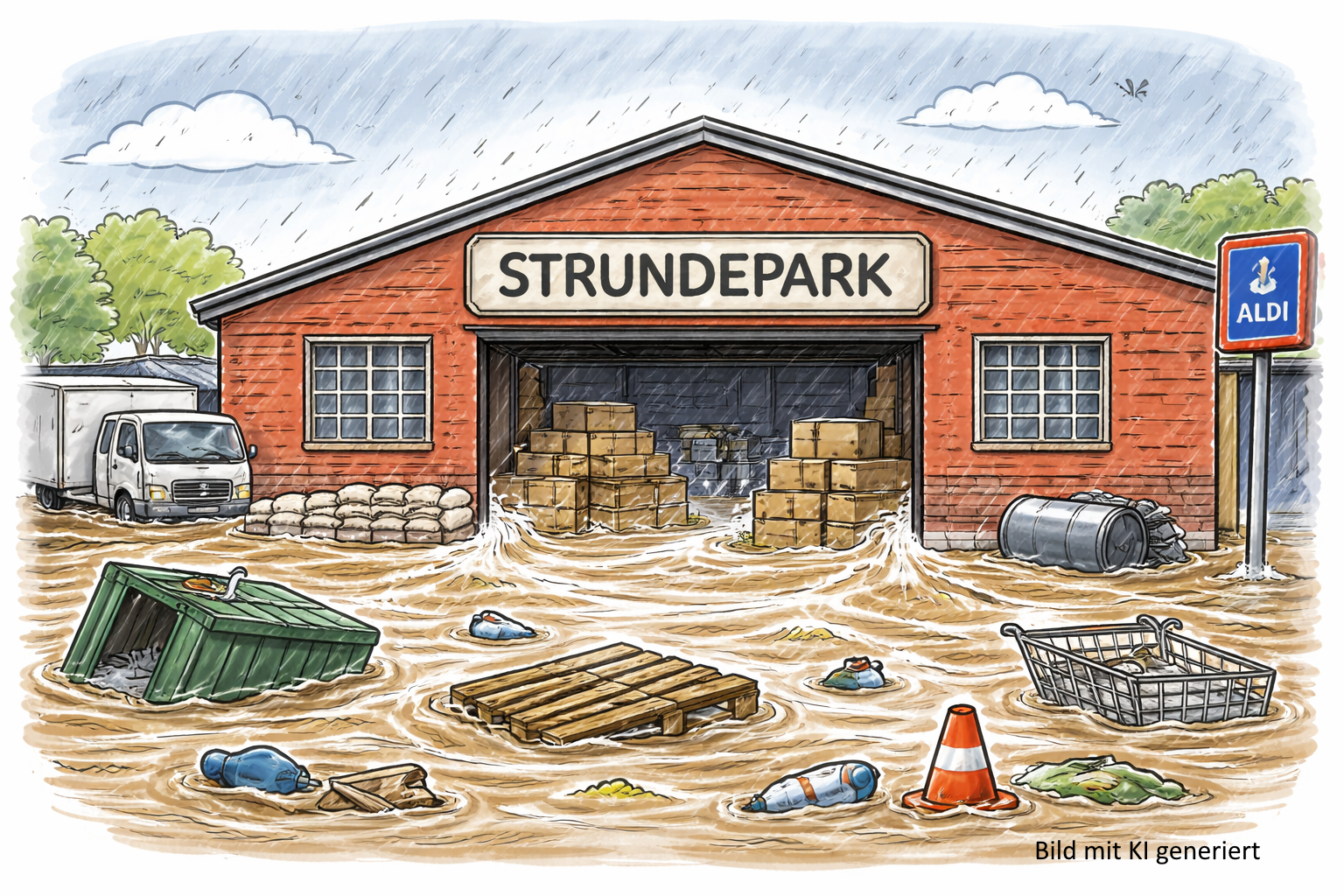 Ökologische Belastung: Zusätzliche Versiegelung, Tiefbau und Verdichtung erhöhen Hochwasserrisiken. Regen fließt schneller in die Strunde und überlastet Kanäle.